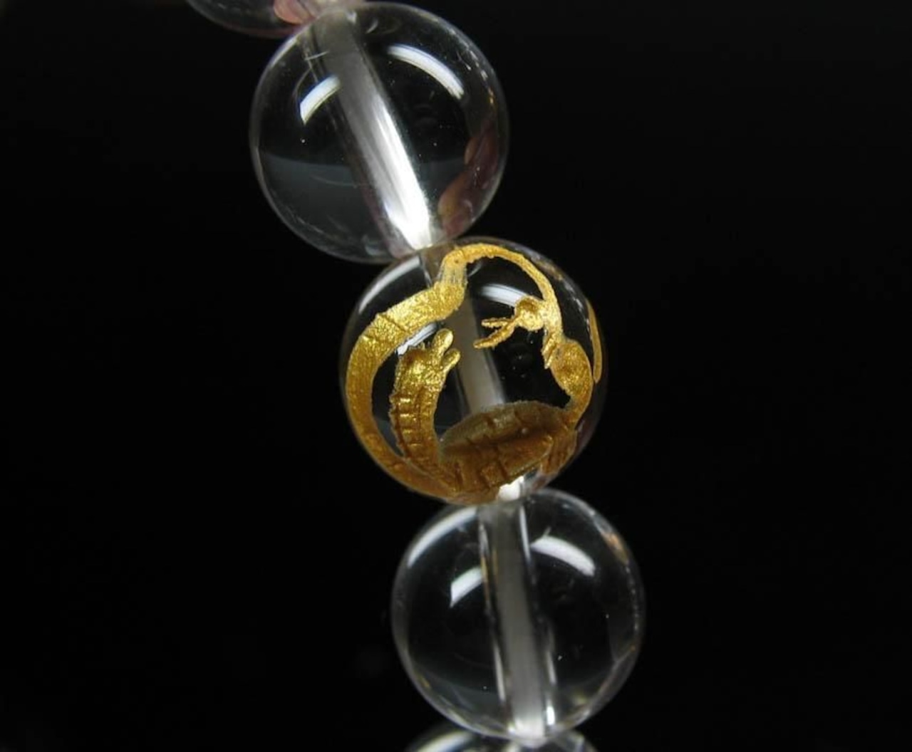 透明天然水晶と金箔入り手彫り水晶四神のブレスレットです。