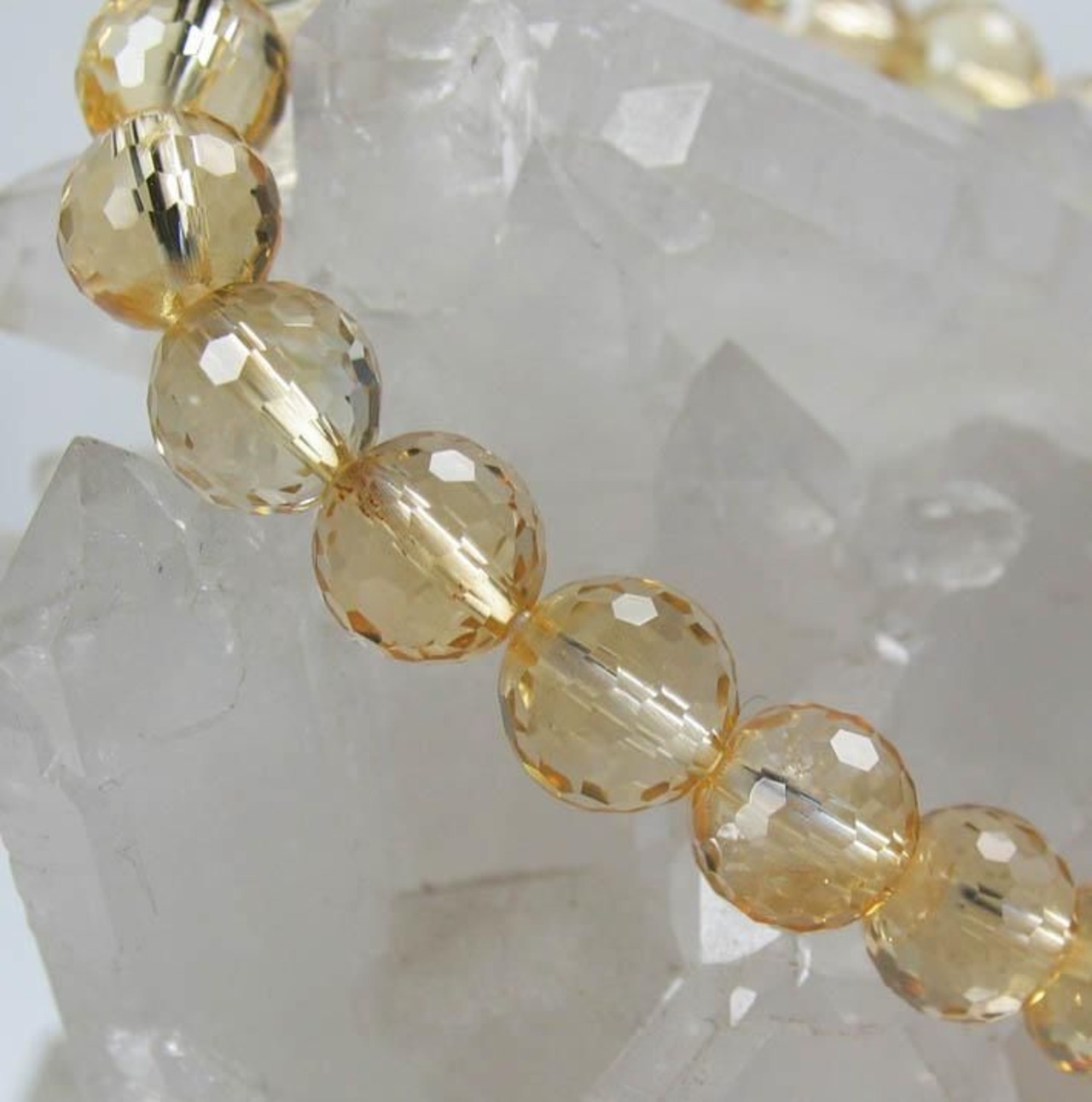 極上の天然シトリンブレスレットです。透明度抜群の128面カット丸玉がキラキラと光を反射し実に美しいです。