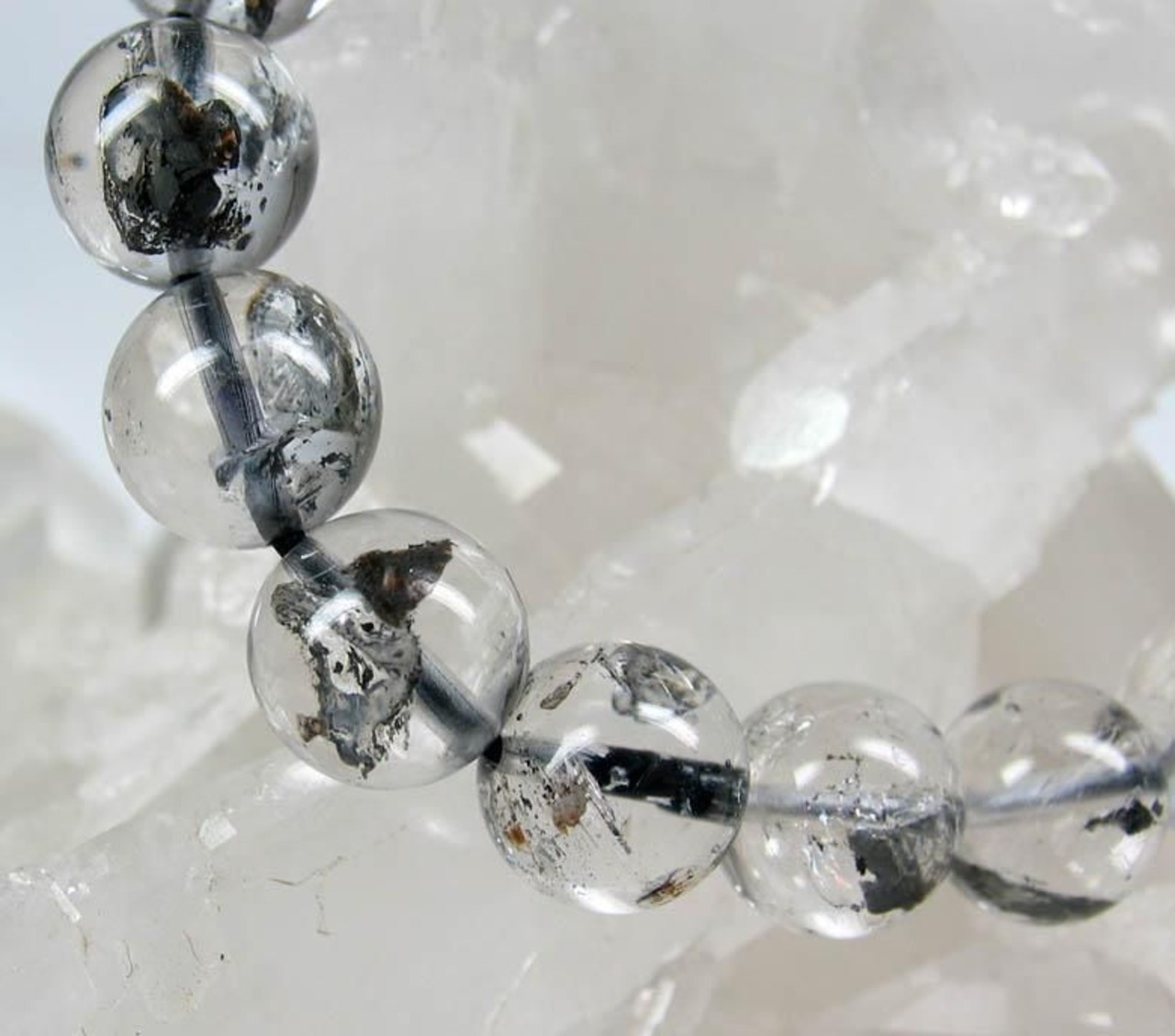 透き通るような透明感の中に黒いインクリュージョンと黒い内包物が見られるのが特徴で、エレスチャルのブレスレットです。