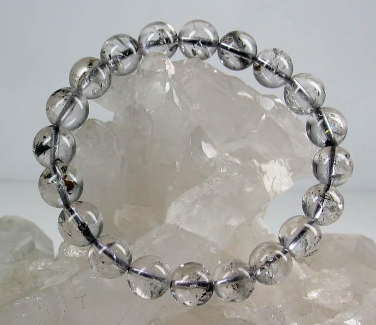 透き通るような透明感の中に黒いインクリュージョンと黒い内包物が見られるのが特徴で、エレスチャルのブレスレットです。