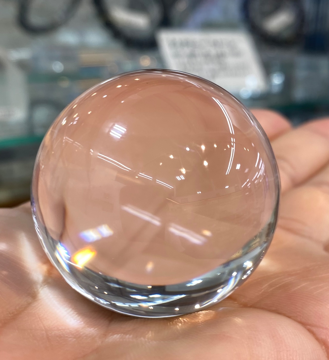 当店のAAAクラス無色透明水晶丸玉は、目視で100%無色透明無傷の天然水晶(ロッククリスタル)丸玉の事を呼びます。肉眼で内包物(極小さな気泡やクラックなど)はまったく見えません。最高級水晶玉です。