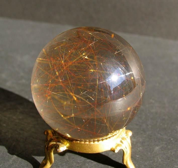 透明度抜群の天然茶水晶にレッドルチル(赤針)が綺麗に入って入るブラジル産水晶丸玉です。