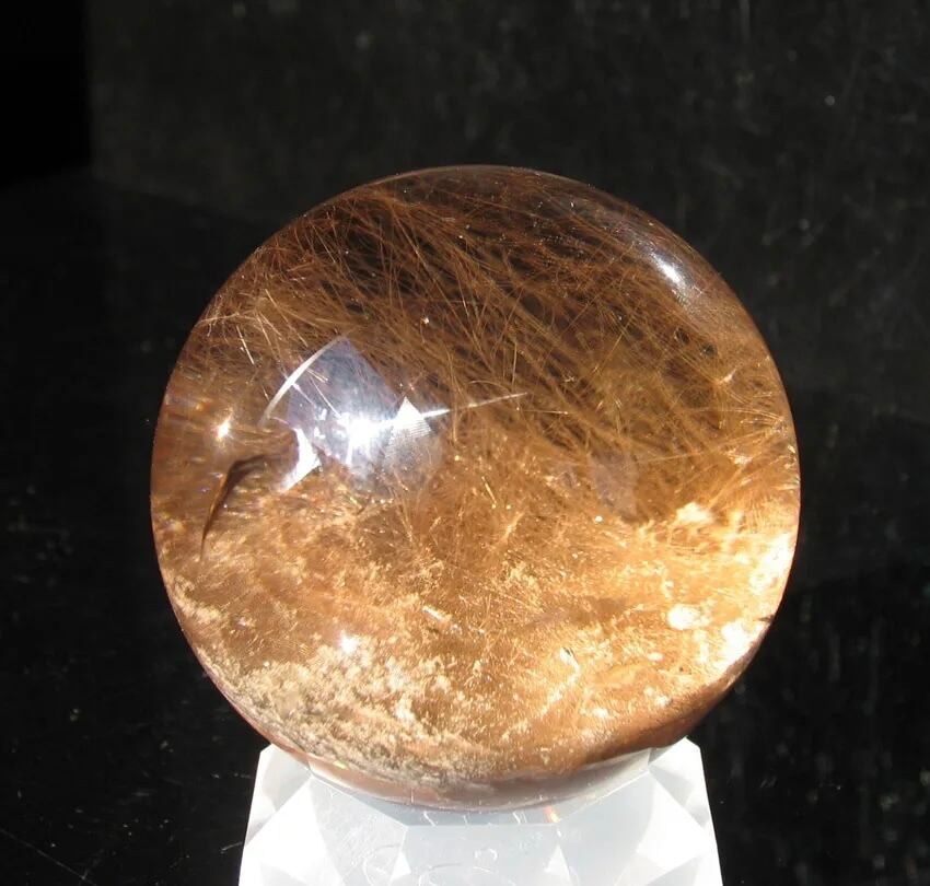 天然茶水晶に赤色を帯びたブラウンルチルが綺麗に入って入るブラジル産水晶丸玉です。