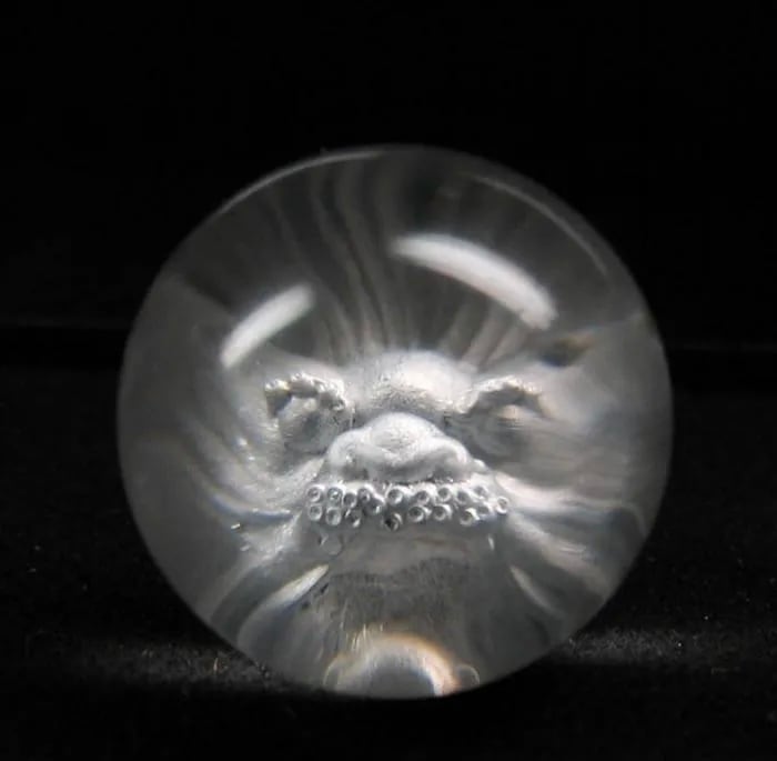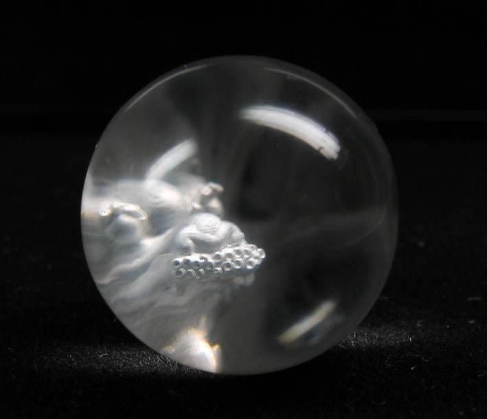 透明度抜群の天然本水晶丸玉を裏面から図象を彫って立体像を浮かびあがらせる特殊技術によって彫り込んだ置物です。この製品は美術品クラスの出来栄えです。