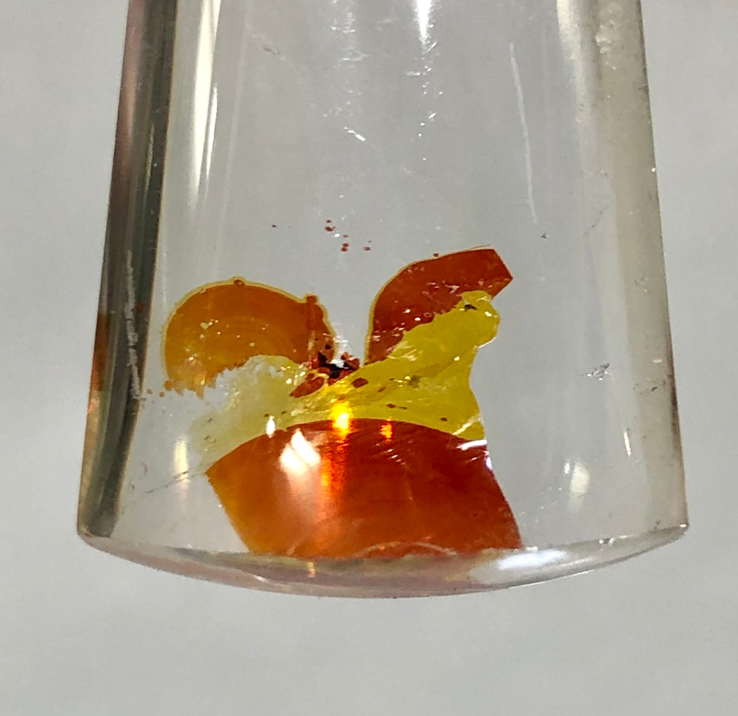 膜状の鮮やかな赤や黄色が水晶に内包されているのが特徴です。