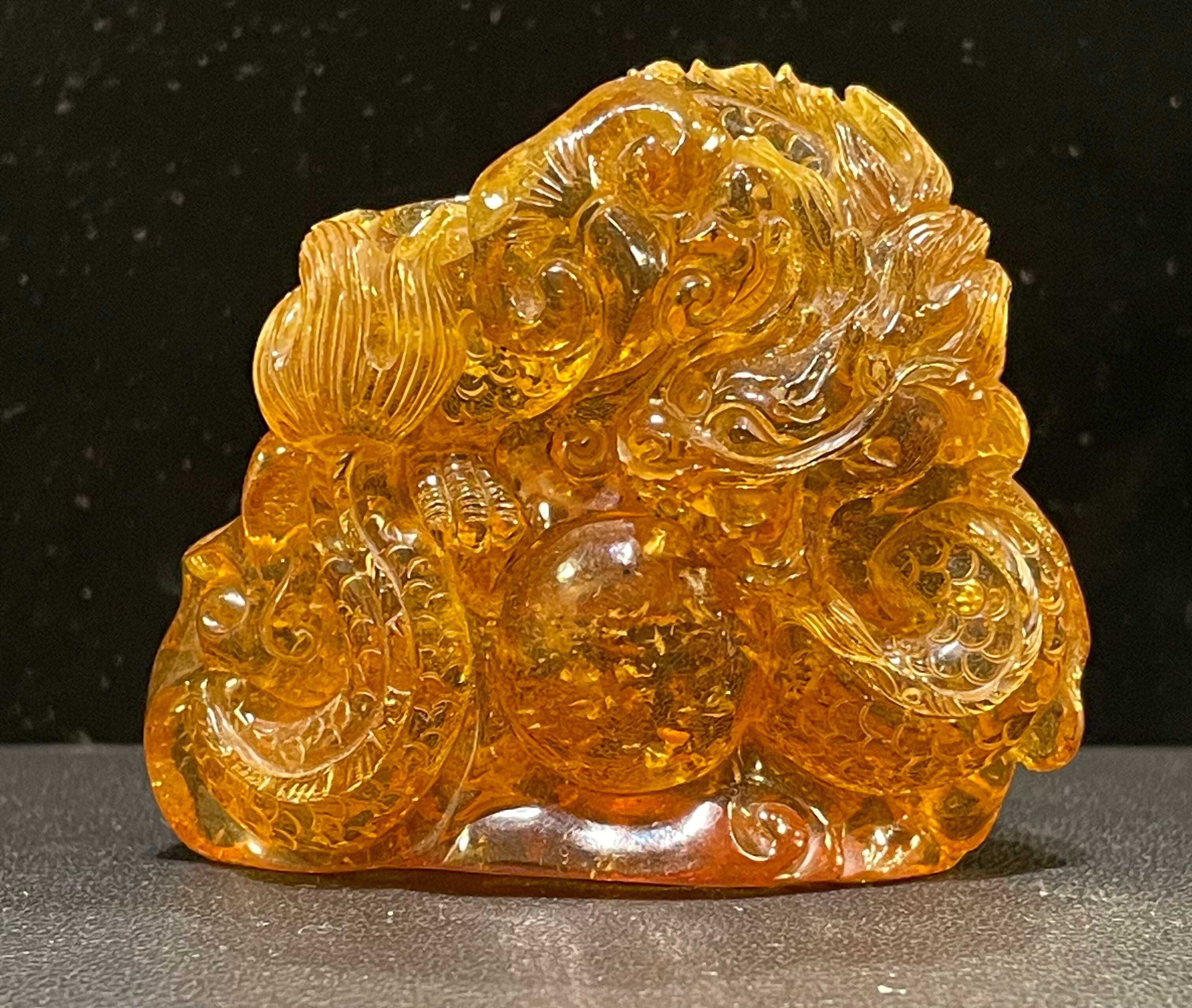 ドミニカ共和国産、天然ブルーアンバー(琥珀)を一流の彫刻師が丹精を込めて彫刻した龍です。一刀彫り。